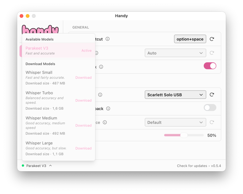 Ce truc est génial aussi bien pour l’accessibilité que pour la reconnaissance vocale en elle-même qui est plutôt utile dans la vie de tous les jours. D’ailleurs, il y a plusieurs modèles IA disponibles, comme tous les modèles Whisper, mais aussi un modèle que je ne connaissais pas, qui s’appelle Parakeet et qui franchement fonctionne très bien. C’est celui que j’utilise actuellement.
