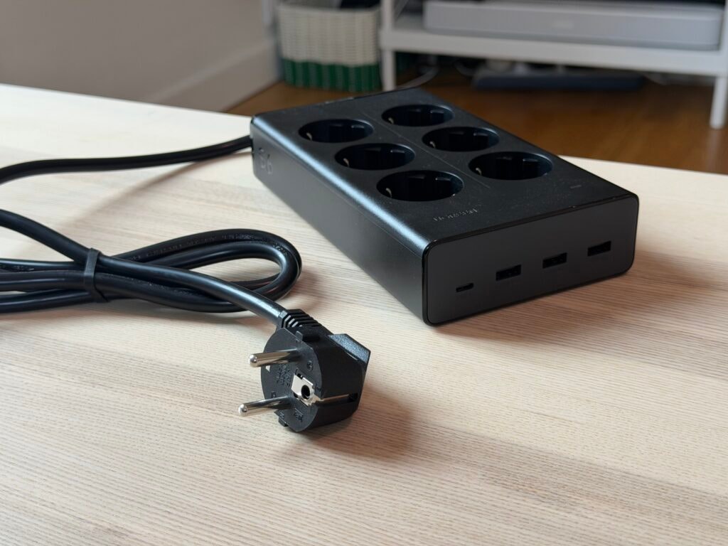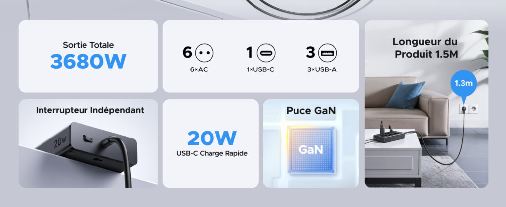 Alors vous allez me dire que des multiprises avec des ports USB et même USB-C ça existe déjà, mais en général ils sont franchement lents. Alors que là, non. Le bloc est équipé d’une puce GaN. Le Nitrure de Gallium, pour les intimes. C’est plus petit, ça chauffe beaucoup moins qu’un chargeur silicium classique, et c’est bien plus efficace énergétiquement. C’est ce qui permet au bloc de ne pas se transformer en radiateur d’appoint tout en délivrant sa puissance. On valide fort.