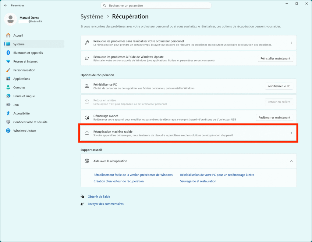 Hé bien, ouvrez les Paramètres Windows avec la combinaison de touches Windows + I puis allez dans Système puis Récupération. Vous allez voir une section “Récupération machine rapide”.